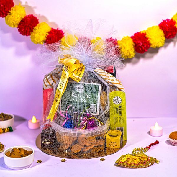 KAJU LITE COOKIES QTY 1, JEERA COOKIES QTY 1, DIVINE CHOCOLATES QTY 2 ASSORTED CHOCOLATES QTY 3, MILK 'N' MIX QTY 1, MANGO KHATAI COOKIES QTY 1, BEETROOT CHIPS QTY 1